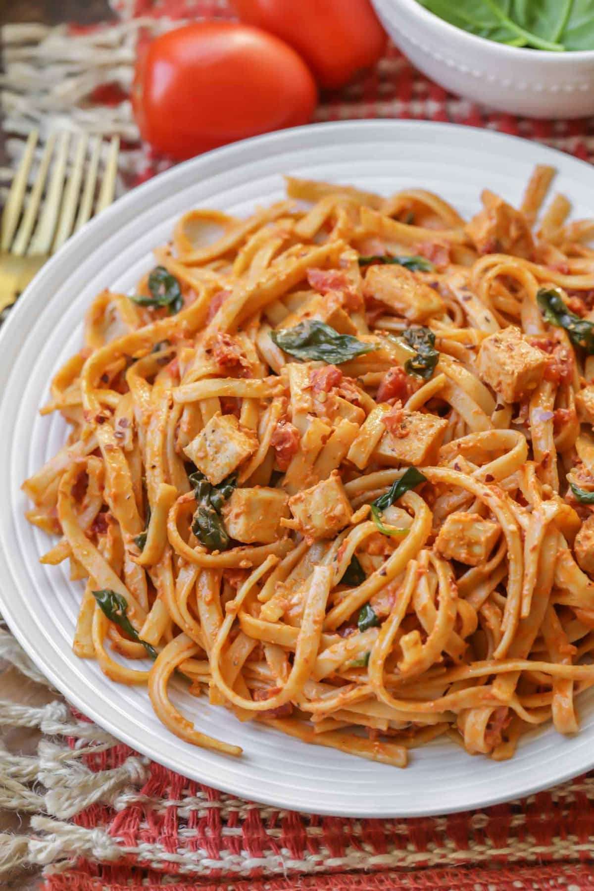 A copycat version of Cheesecake Factory's Sun-Dried Tomato Fettuccine recipe. This flavorful and creamy dish is filled with chunks of chicken, garlic, whipping cream, spinach and sweet sun-dried tomatoes. It's not only delicious but is a great way to change up the classic fettuccine recipe.