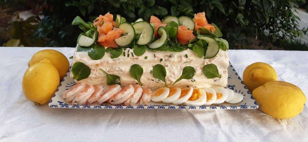 - Cover the cake with the decoration mix of cream fresh and mayonnaise. Decorate the top of the cake with salad, finely chopped chives, slices of cucumber and the salmon roses.