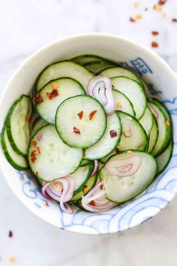 These tangy and oh-so-simple-to-make sweet and sour Asian pickled cucumbers take only about 5 minutes to make, and are one of our favorite snacks.