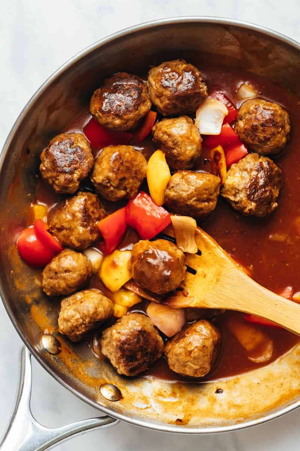 Soft, juicy meatballs tossed in a delicious sweet and sour sauce with bell peppers and onions.