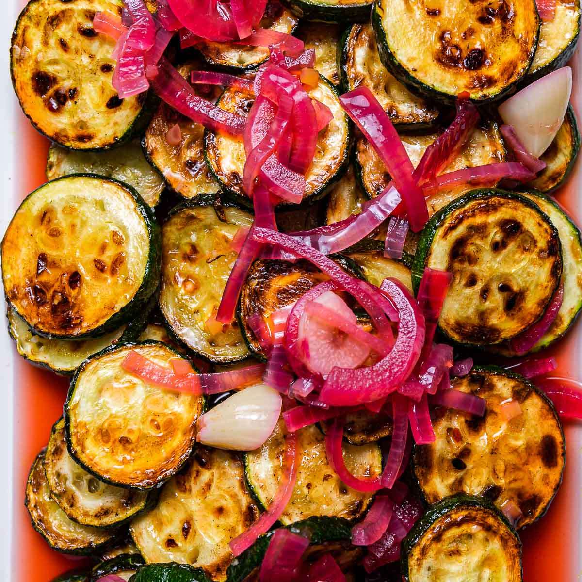 - Layer the zucchini in a flat dish and pour the vinegar sauce on top. If the sauce doesn't touch all of the zucchini, flip the top layer after 15 minutes or so. Let the zucchini sit for about 30 minutes to absorb the sauce, then refrigerate for at least 1 hour to chill.