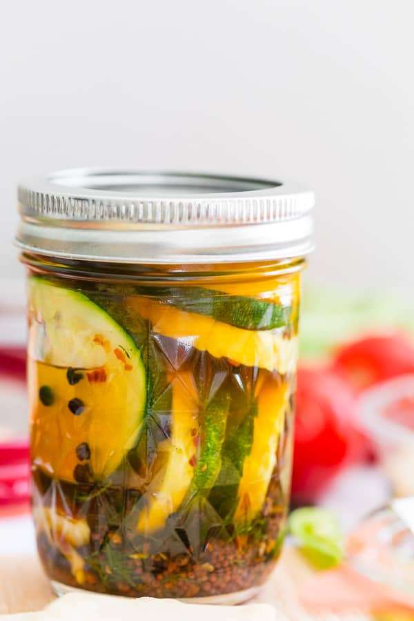 - Pour hot brine over the pickles making sure the zucchini is fully submerged.