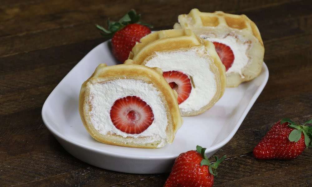- Place strawberries in the middle of the waffle. Then using the plastic wrap for support, roll up the waffle until the ends meet. (Don't worry if the topping squishes out.) Chill 2 hours.
