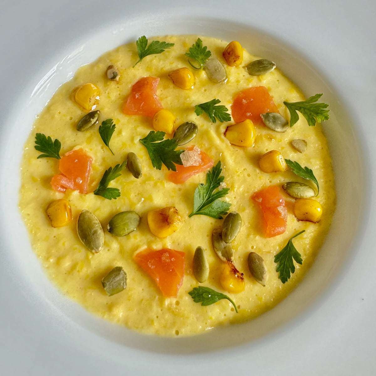 - To serve: add the fresh parsley leaves and a sprinkling of smoked paprika. For the ultimate restaurant style recipe, serve with a savoury macaron or decorate with tiny parsley leaves, extra fried corn, pumpkin seeds, a little avocado oil and, if not for vegetarians, some smoked salmon.