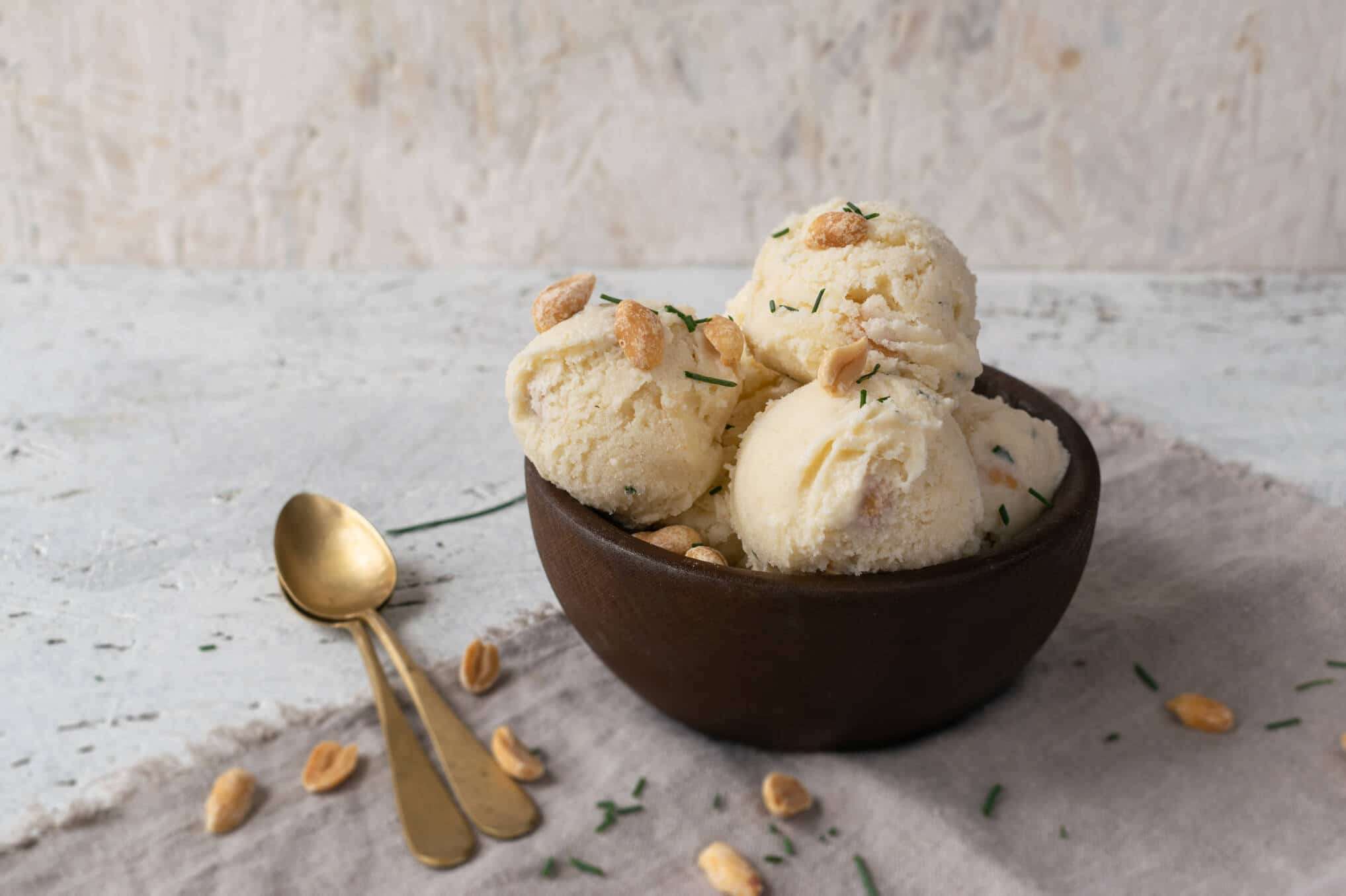 - Place the ice cream base in a shallow metal pan. Stir in the chives and peanuts, if desired. Place the pan in the freezer. Stir every 20 minutes for approximately 2 to 3 hours until the desired consistency is achieved.