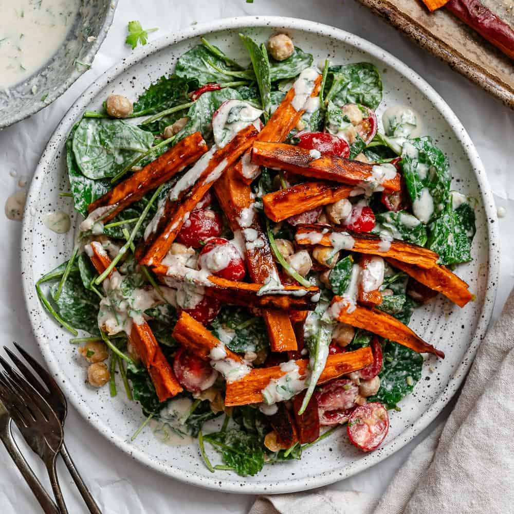 - Mix in the tomatoes and chickpeas. Top with the sweet potato and serve with more dressing on the side.