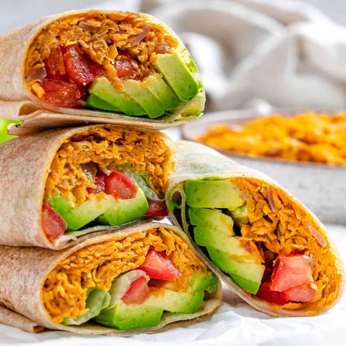 - Add ¼ filling to each tortilla, then add avocado and tomato and wrap it up.