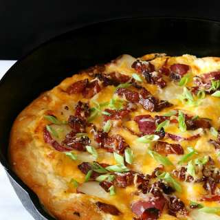 - Remove the pizza from the oven evenly spread the pizza sauce over the top. Top with the Jones Dairy Farm Canadian bacon and the diced pineapple. Sprinkle the cheese over the top. Return the pizza to the oven and cook an additional 10-15 minutes, until the cheese is melted and bubbly.