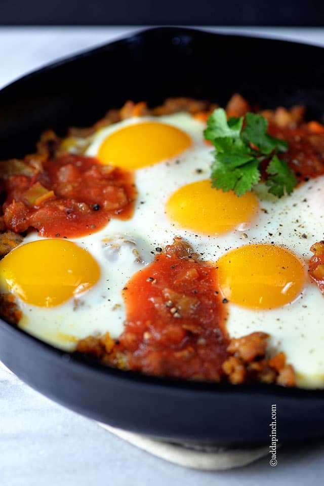 - Make five large indentions into the hash with the back of a large spoon. Crack one egg into each of the indentions. Place skillet into the preheated oven and bake until the eggs have just set, about 8 to 12 minutes.