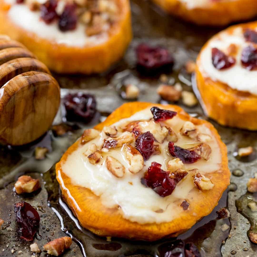 Delight your holiday guests with Sweet Potato Rounds with Goat Cheese! They're loaded with fall flavors for the perfect party bite!