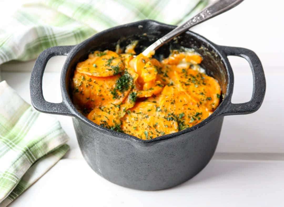 Sweet Potatoes and onions are baked in a garlic and rosemary-infused coconut broth to creamy, delicious perfection in this delightful side dish.