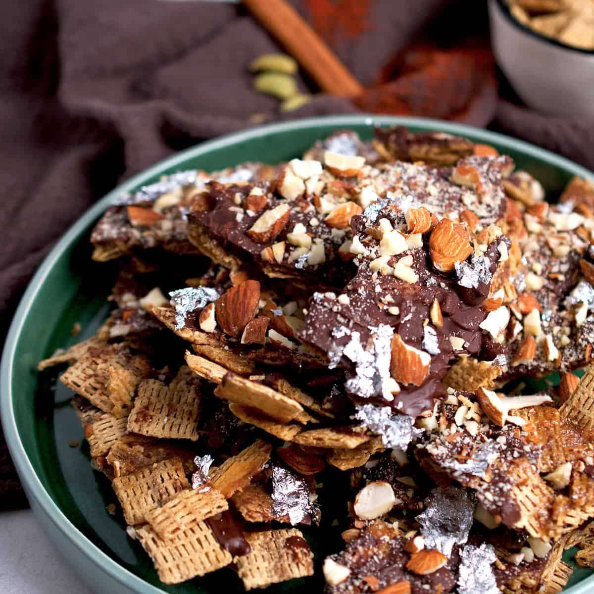 This sweet & salty Chex mix recipe, a perfect holiday treat, is made with a blend of spices and layered with toffee, chocolate, and almonds.