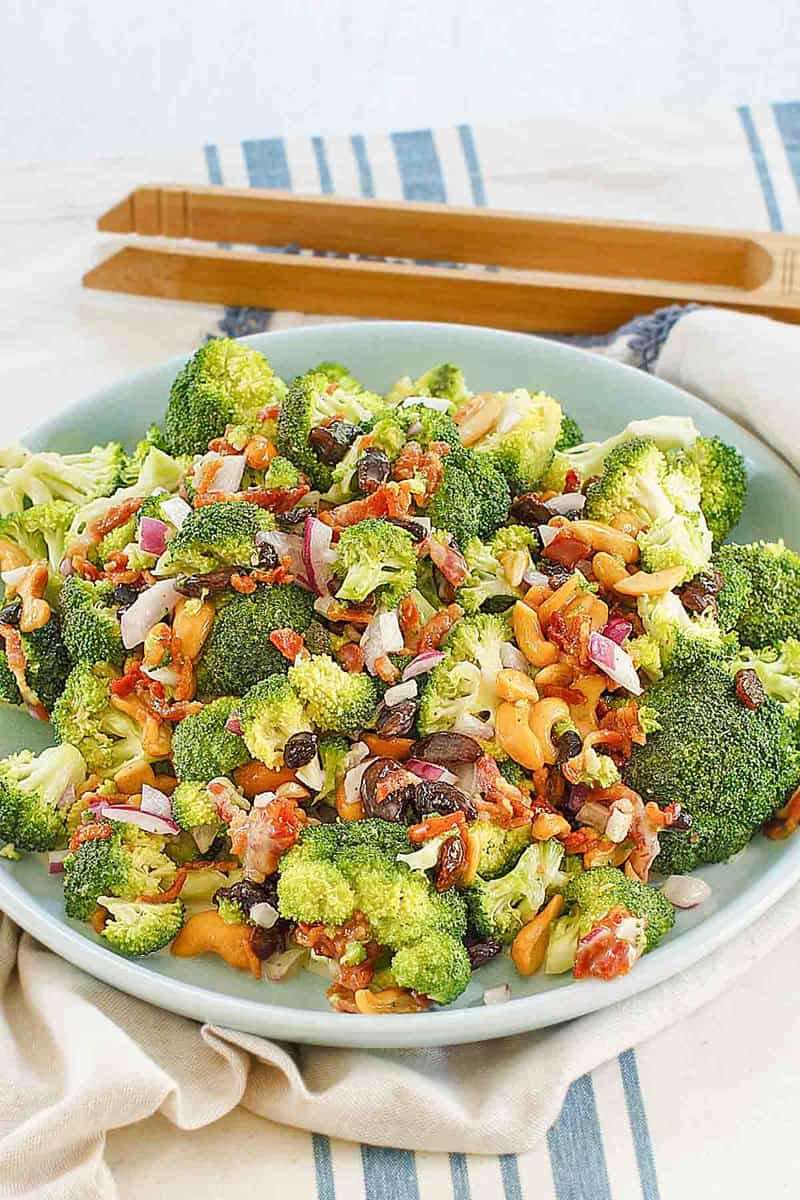 - Add broccoli, cashews, raisins, bacon bits, and red onion.