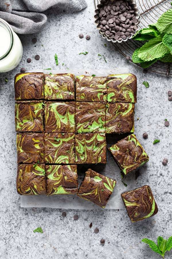 These swirled mint cream cheese brownies feature thick and fudgy dark chocolate brownies made from scratch with a sweet and minty cream cheese swirl on top. Perfect for holidays, St.Patrick's day, or any occasion. The best brownies for mint chocolate lovers!