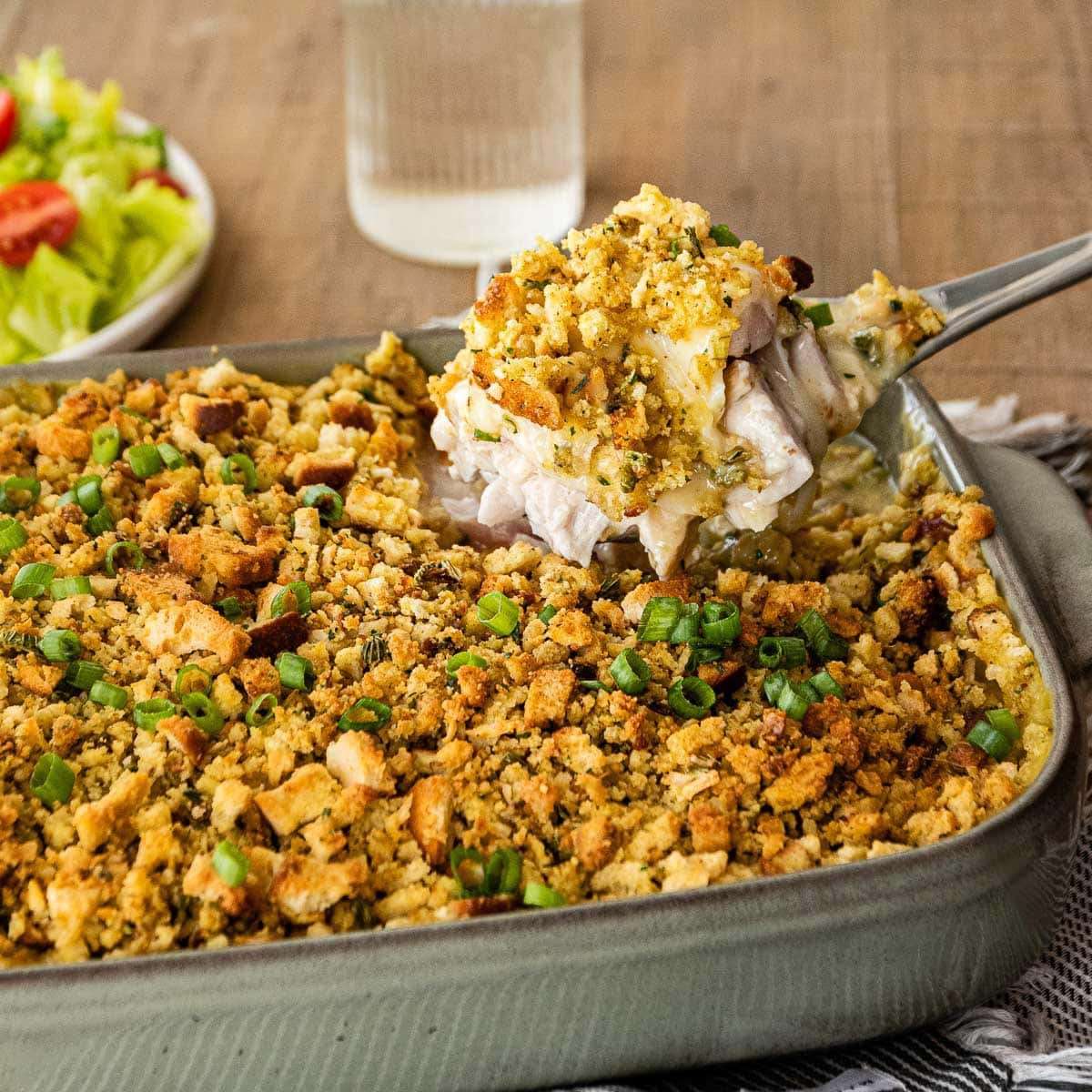 Swiss Chicken Casserole is the perfect comforting weeknight dinner with a rich, creamy, cheesy coating, and flavorful stuffing mixture.