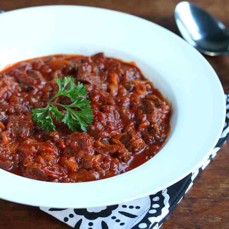 This Szegedin Goulash features slow-simmered, succulent meat, onions and sauerkraut in a wonderfully rich paprika-infused broth. It's incredibly delicious!