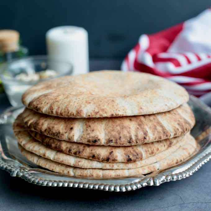 - Coloque cada pan en la piedra caliente y hornéelos durante aproximadamente 4 minutos por lado hasta que se inflen.
