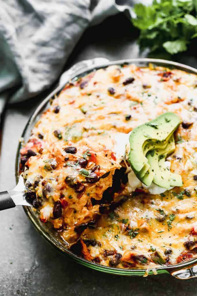 - Bake for 30 minutes or until cheese is bubbly and mixture is warmed through. Serve topped with sour cream, chopped cilantro and avocado.