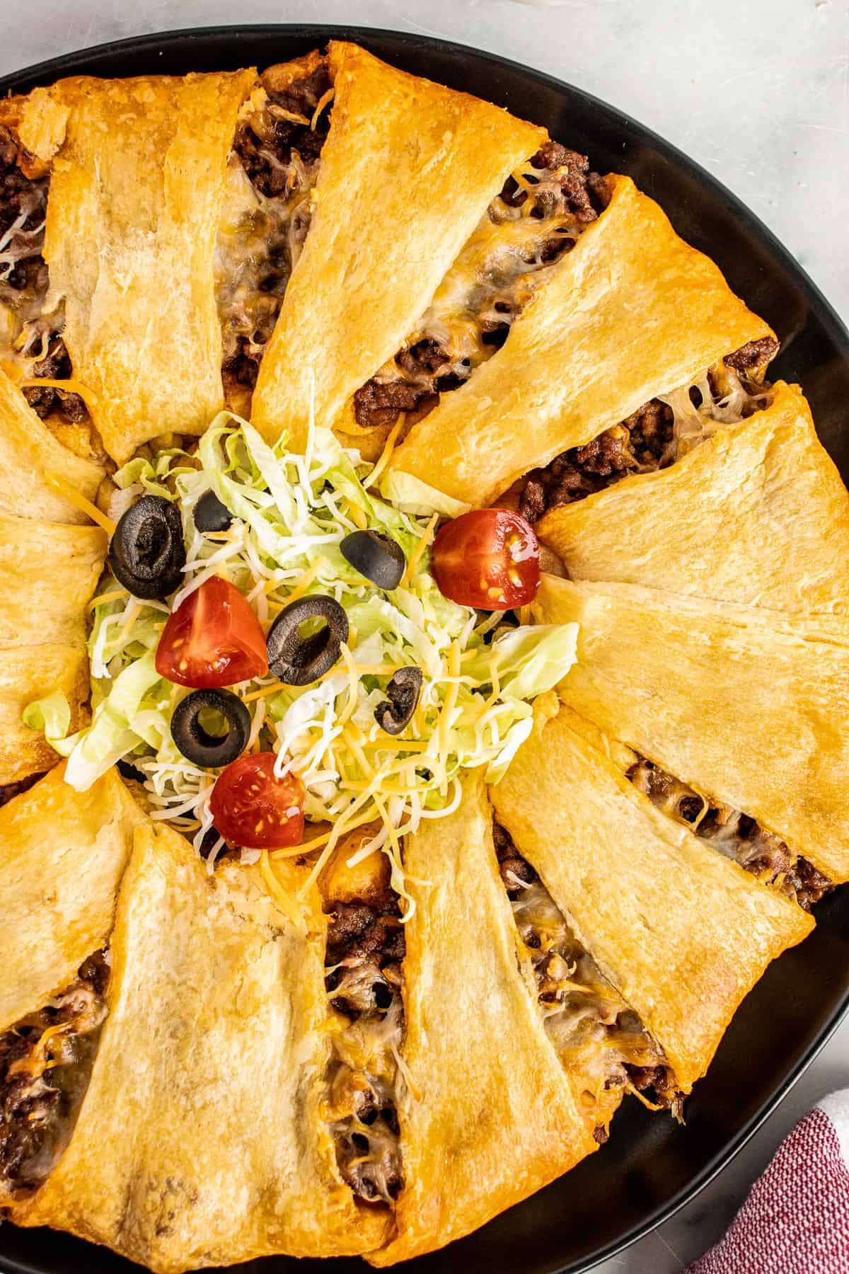 Crescent Roll Dough in a pinwheel shape stuffed with taco meat and cheese. Serve it with your favorite taco toppings.