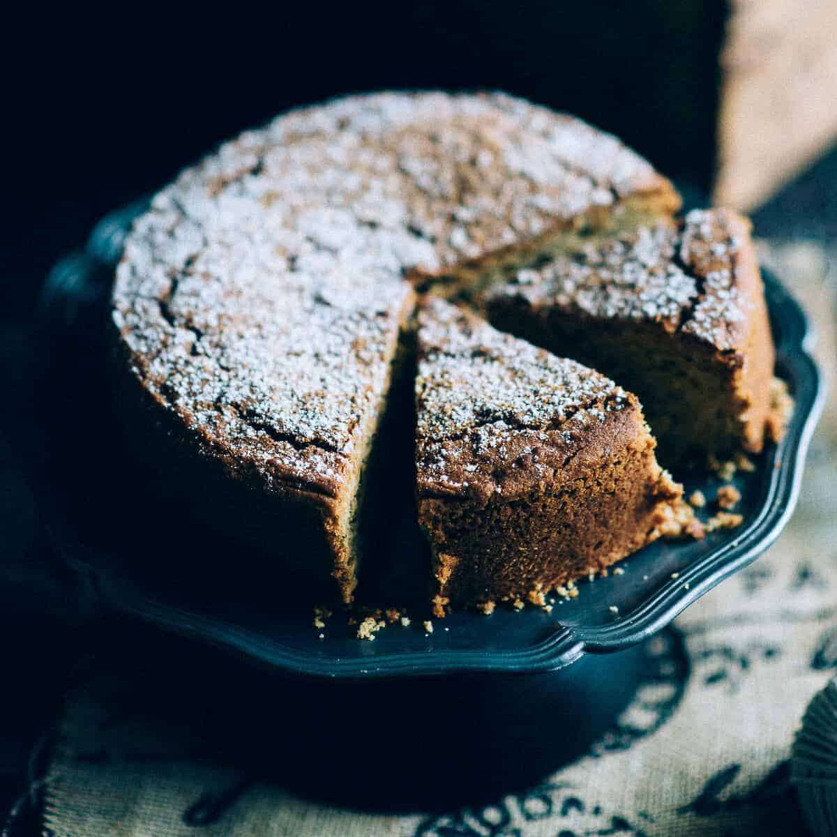 A vegan cake made with tahini. It’s also spiced with cinnamon and orange for a little extra flavour.