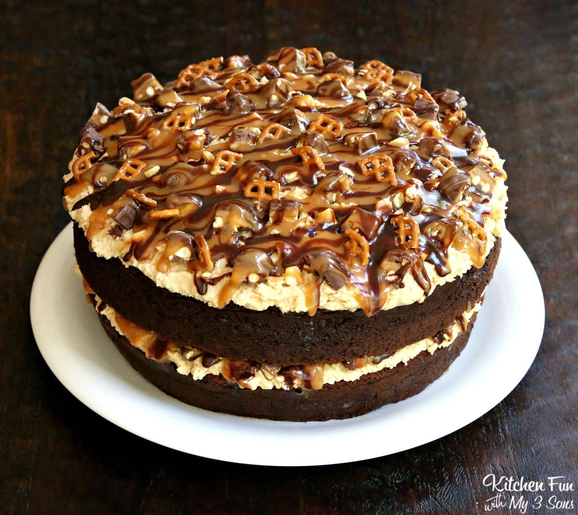 This Take 5 Cake is a deliciously layered chocolate cake with peanut butter filling, chopped candy bars, caramel, and chocolate. It is loaded and ready to cure your sweet tooth!