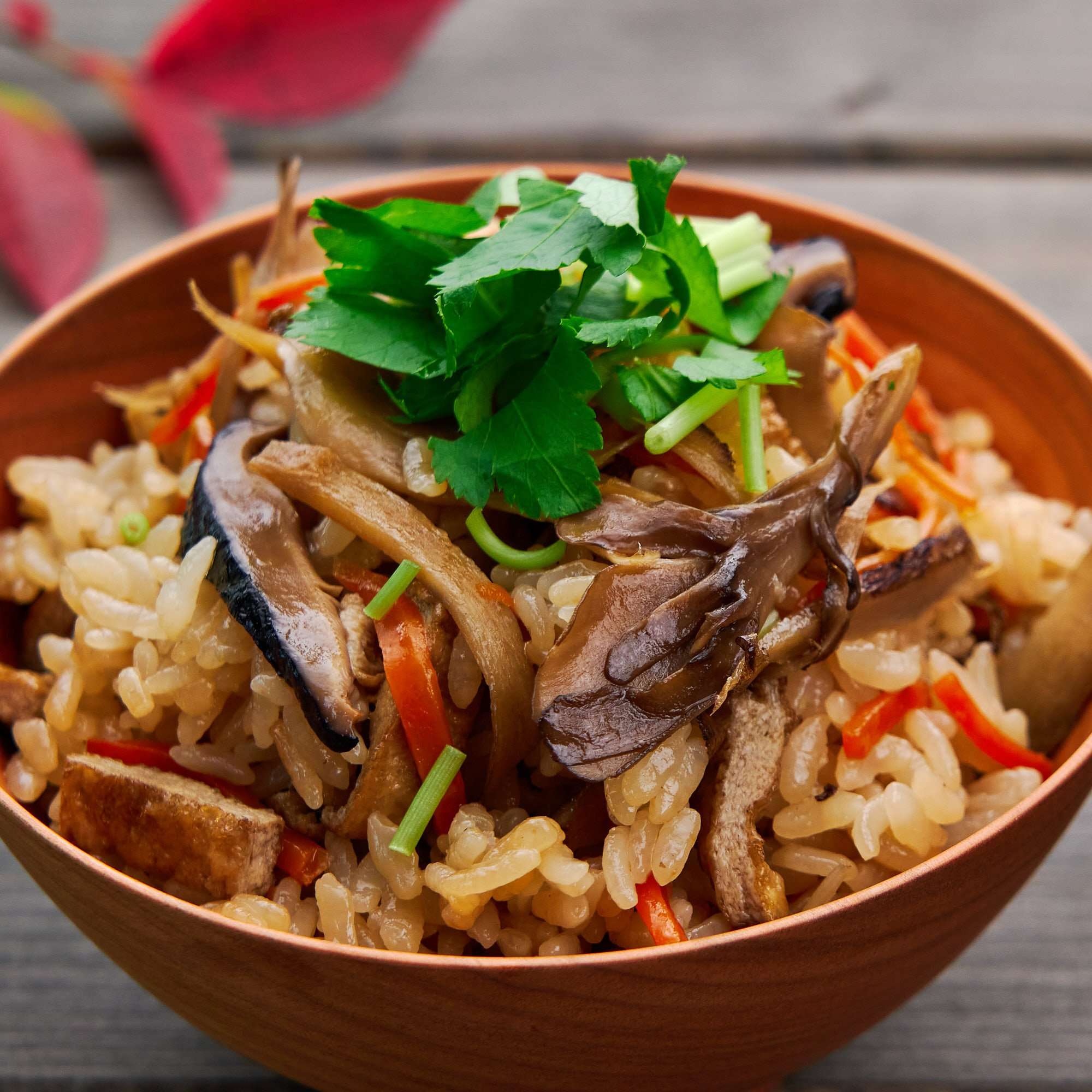This Takikomi Gohan, also known as Gomoku Gohan, is a mixed vegetable and mushroom rice that's like a Japanese-style pilaf. It's plant-based, making it vegan and vegetarian friendly, but it's packed with umami thanks to the addition of a few ingredients like shiitake mushrooms, konbu cha, and sake.