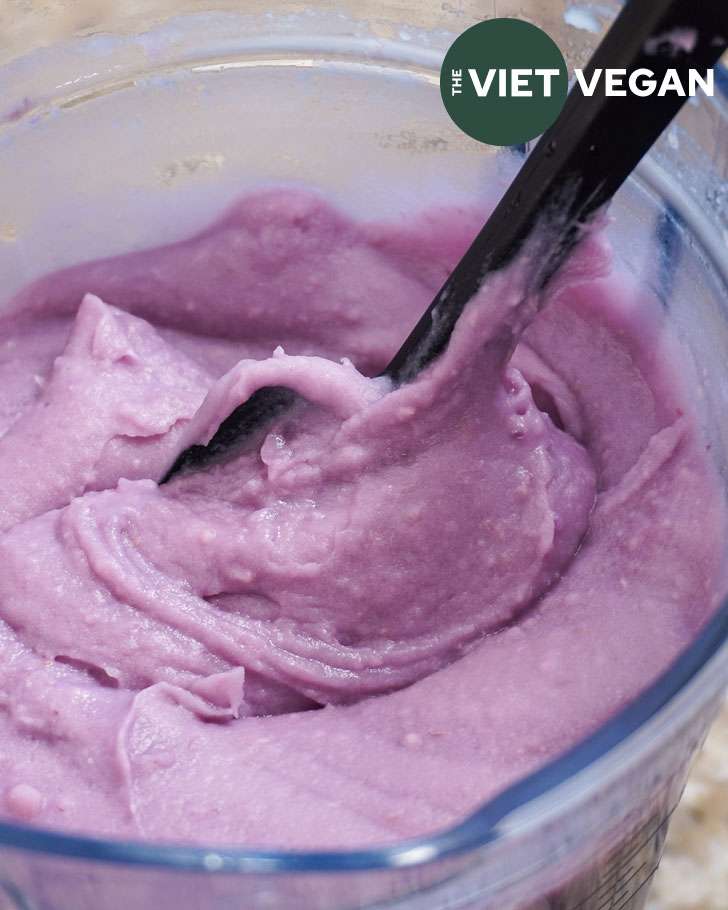 - Transfer the steamed taro and sweet potato to a blender or food processor and add sugar and plant-based milk, and blend until smooth. If you need to add more liquid for the mixture to blend, add as needed.