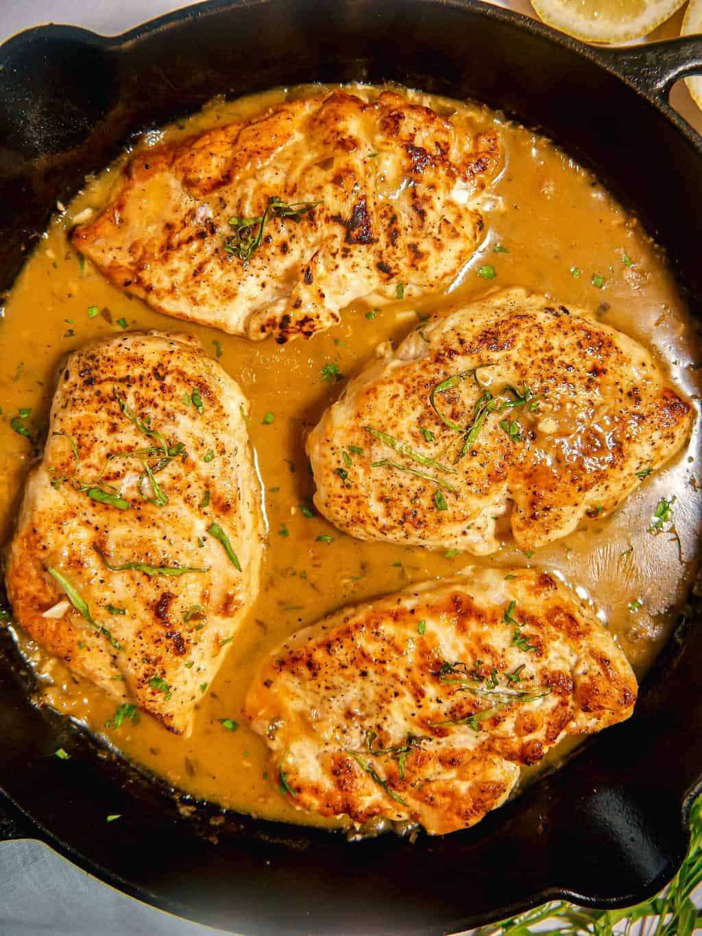This tarragon chicken skillet is not only easy, but full of flavor. Deliciously seared chicken breasts in a made from scratch tarragon mustard sauce.