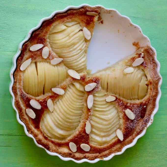 The tarte Bourdaloue is a tart prepared with almond cream and poached pears, which was created in a Parisian pastry shop in the middle of the 19th century.