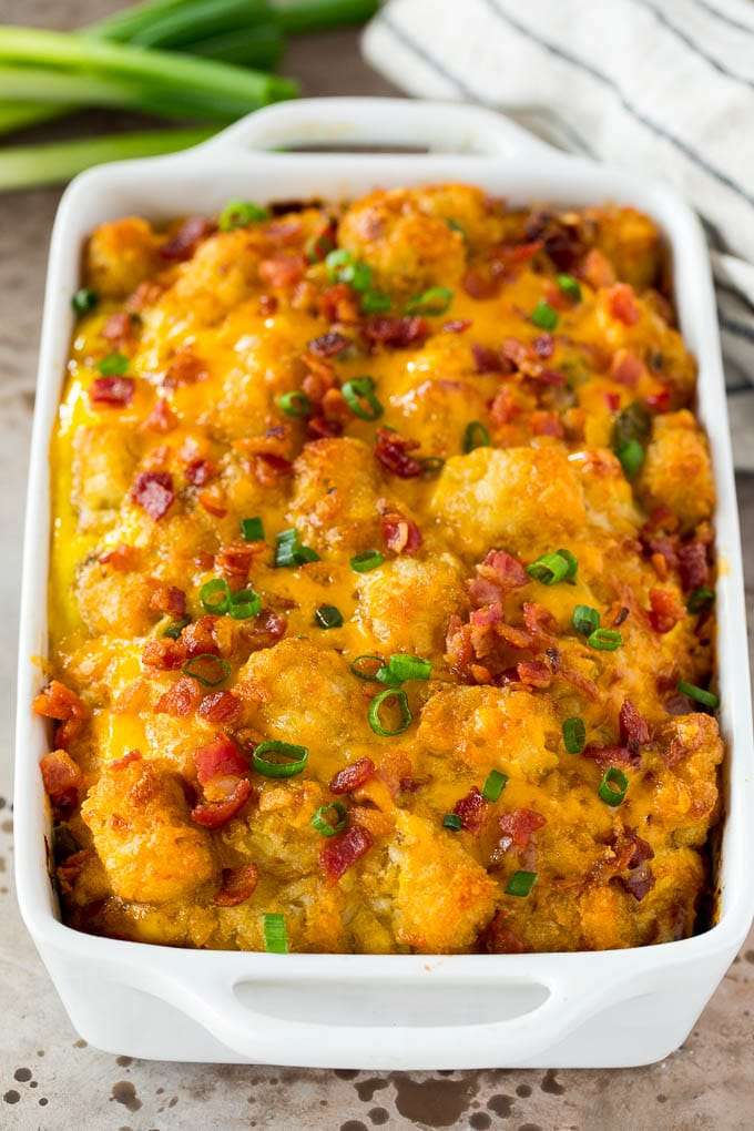 This tater tot breakfast casserole is made with bacon, eggs, veggies, potato tots and plenty of cheese, all baked together to create a hearty and delicious meal. The perfect casserole for any breakfast or brunch gathering, and it always gets rave reviews!