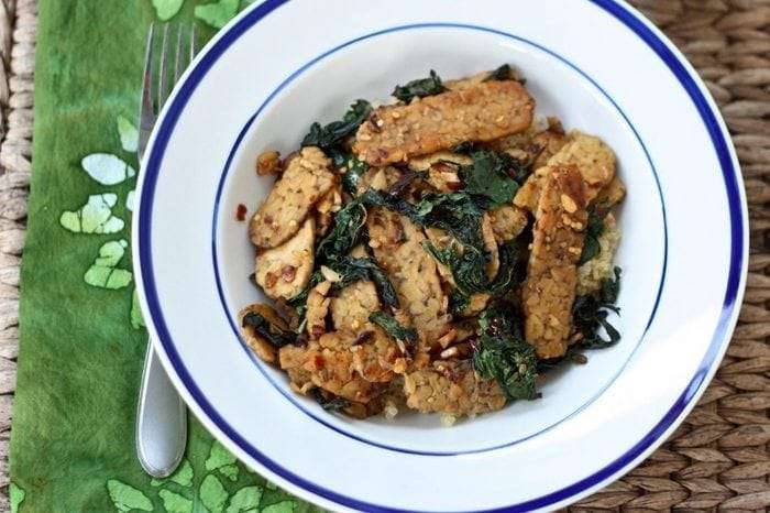 A flavorful one skillet meal with tempeh, sautéed kale and coconut aminos.