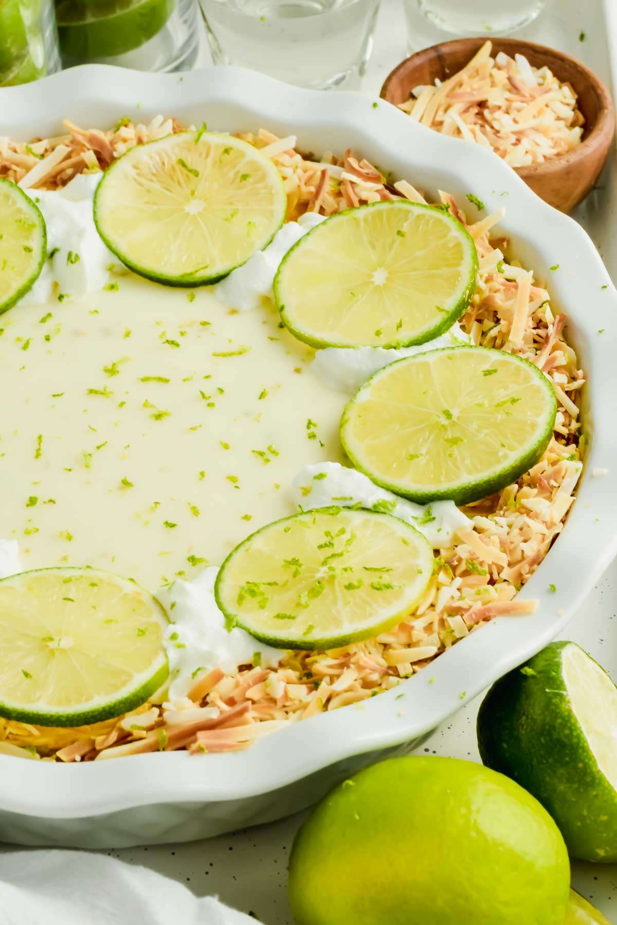 - Let your Tequila Key Lime Pie cool, then place in the freezer for 2-3 hours. Before serving, garnish with toasted coconut flakes and lime slices. Thaw slightly (~10 minutes) before using a sharp knife to cut individual slices. Wipe off your knife between each cut for cleaner pieces. Serve with a tequila shot and enjoy ;)