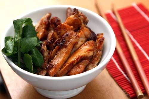 Adapted from Japanese Farm Food (Andrews McNeel) by Nancy Singleton Hachisu Nancy refers to this teriyaki recipe as “country-style”, which I think means the marinate isn’t as sweet or sticky as other styles of teriyaki. This is a straightforward recipe with a simple marinade, which is perhaps how farm folks eat in Japan. This recipe uses boneless chicken thighs. If you can only get bone-in ones, simply turn the chicken thighs skin-side-down, make two slices on both sides of the single bone, the cut it off at the top, where it’s attached and pull it out. Some might inquire about boneless, skinless chicken breasts, which I suppose you could use with this marinade, but I would advise against them as they’ll dry out when cooked. You’ll probably have to cook these in batches, as I did, unless you have an outdoor grill, then use that. If using a grill pan, don’t clean it between batches; the juices will collect after each cooking and darken the chicken nicely as you go.