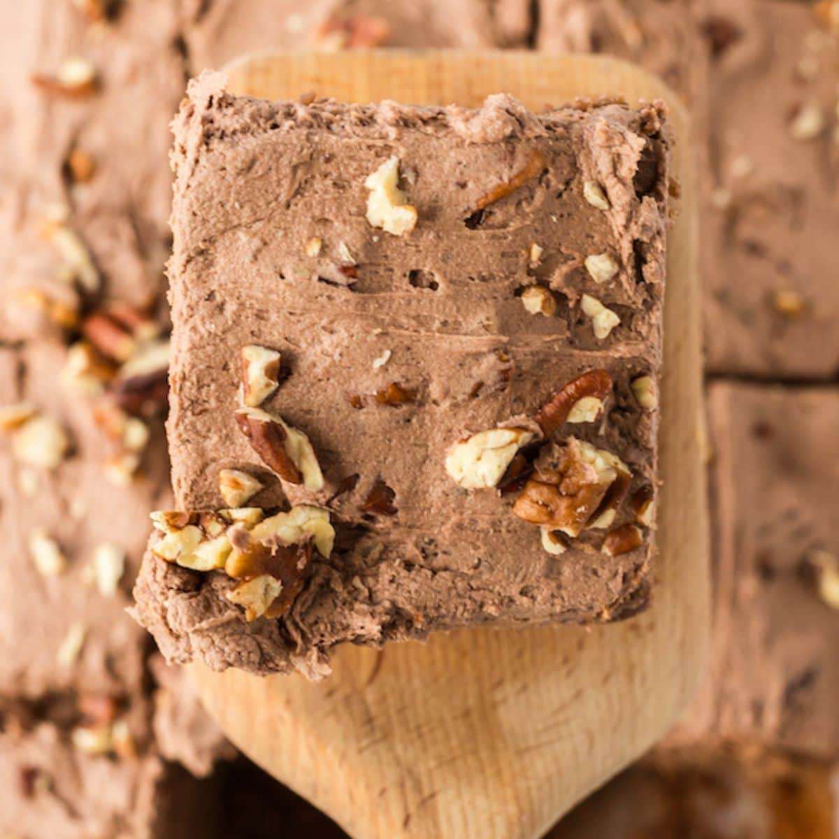 - Remove the cake from the oven and allow it to cool in the fridge for 1 hour. When the cake has about 15 minutes of cooling time left, whisk together the remaining butter, cocoa powder, powdered sugar, and chopped pecans until smooth and creamy.