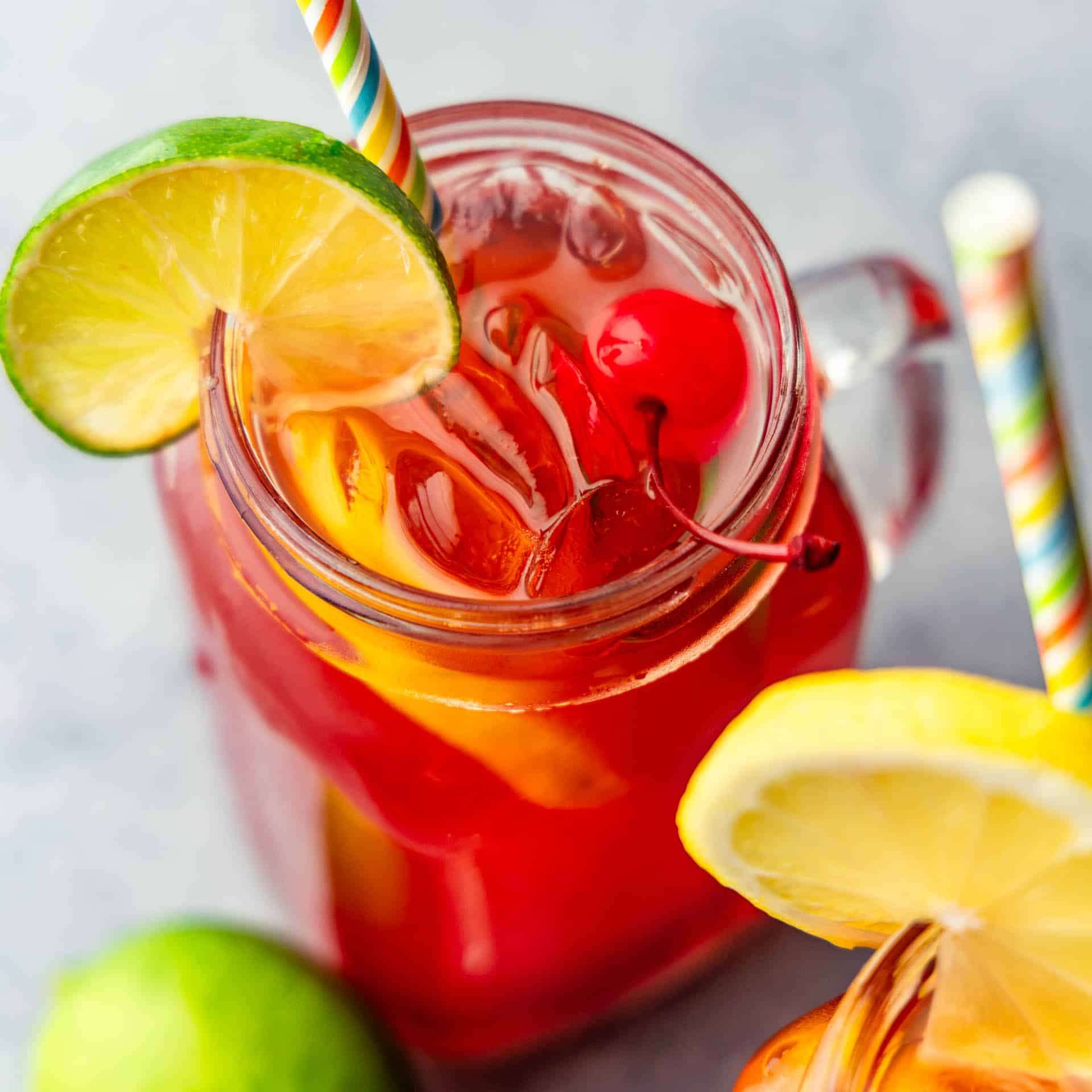 - Place the sliced citrus into a large drink container or pitcher. Pour in the contents of the blender and then add in the 8 cups lemon-lime soda and full undrained jar of 12 ounces maraschino cherries.