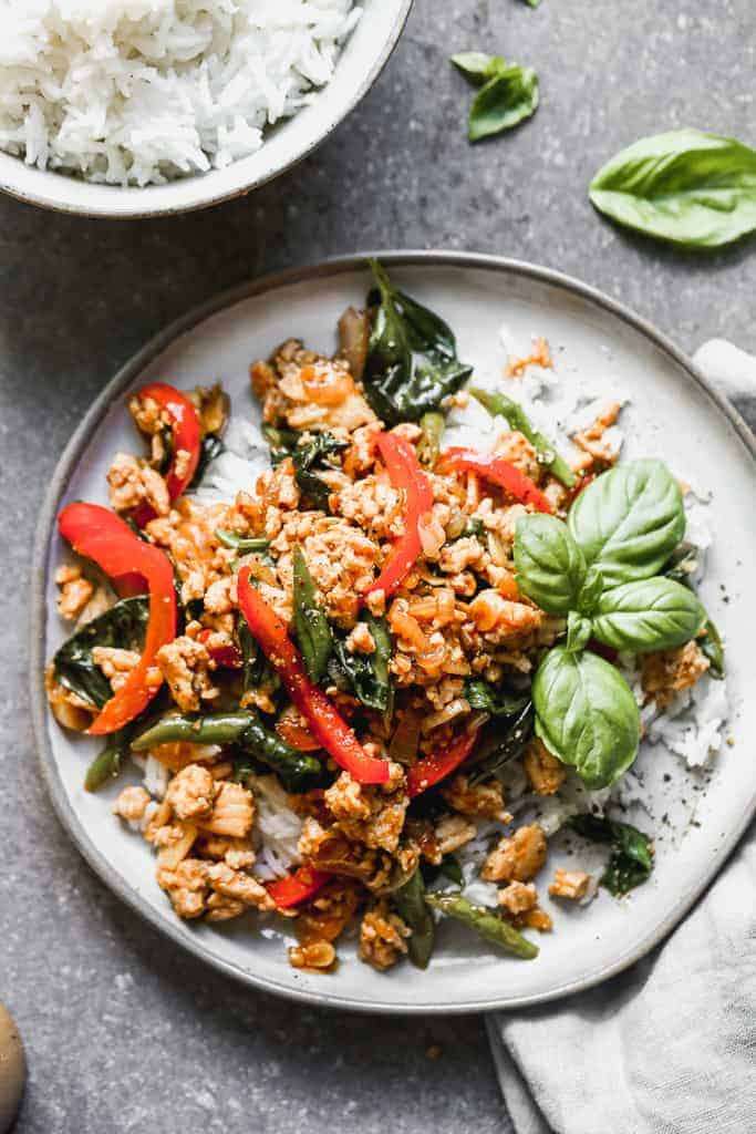 An authentic street food favorite, Thai Basil Chicken can be prepared in less than 30 minutes, with the enticing aroma from garlic, ginger, oyster sauce and chili paste, served over Jasmine rice.
