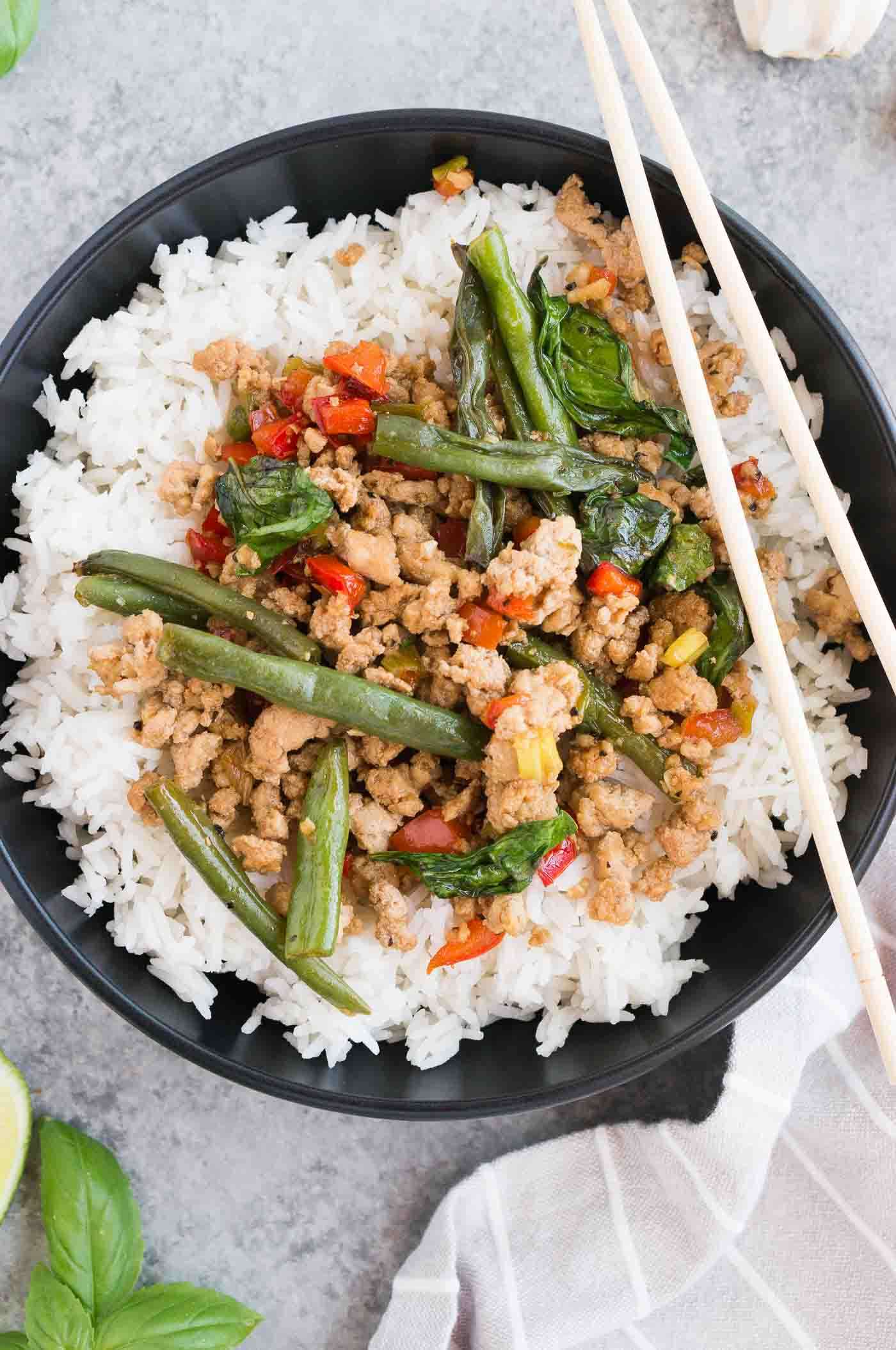 Skip the takeout and cook up this stir fried Thai basil chicken in less than 20 minutes. Wonderfully fragrant with just the right amount of spice, ground chicken is cooked with fresh veggies and chilies in a sweet and savory sauce.