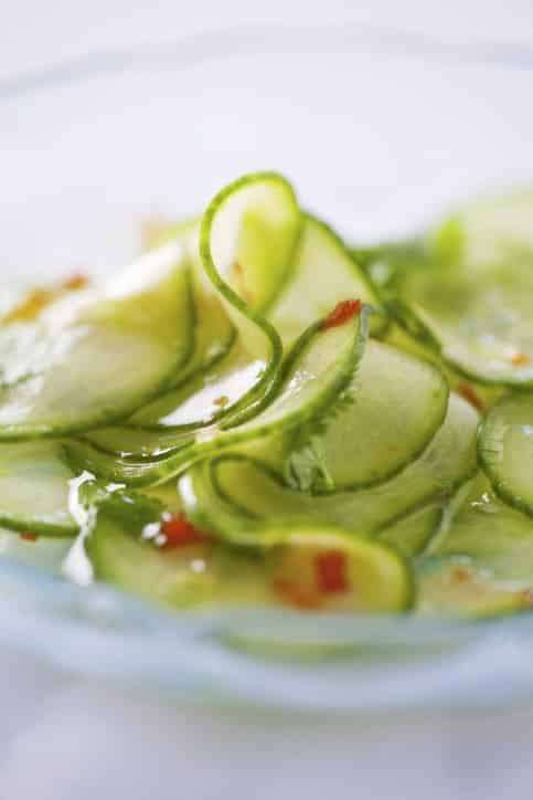 - 3 large cucumbers peeled; trimmed and very thinly sliced into rounds