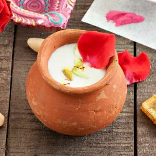 - Strain the thandai if you like. Refrigerate and serve chilled. Garnish with sliced pistachios and rose petals.