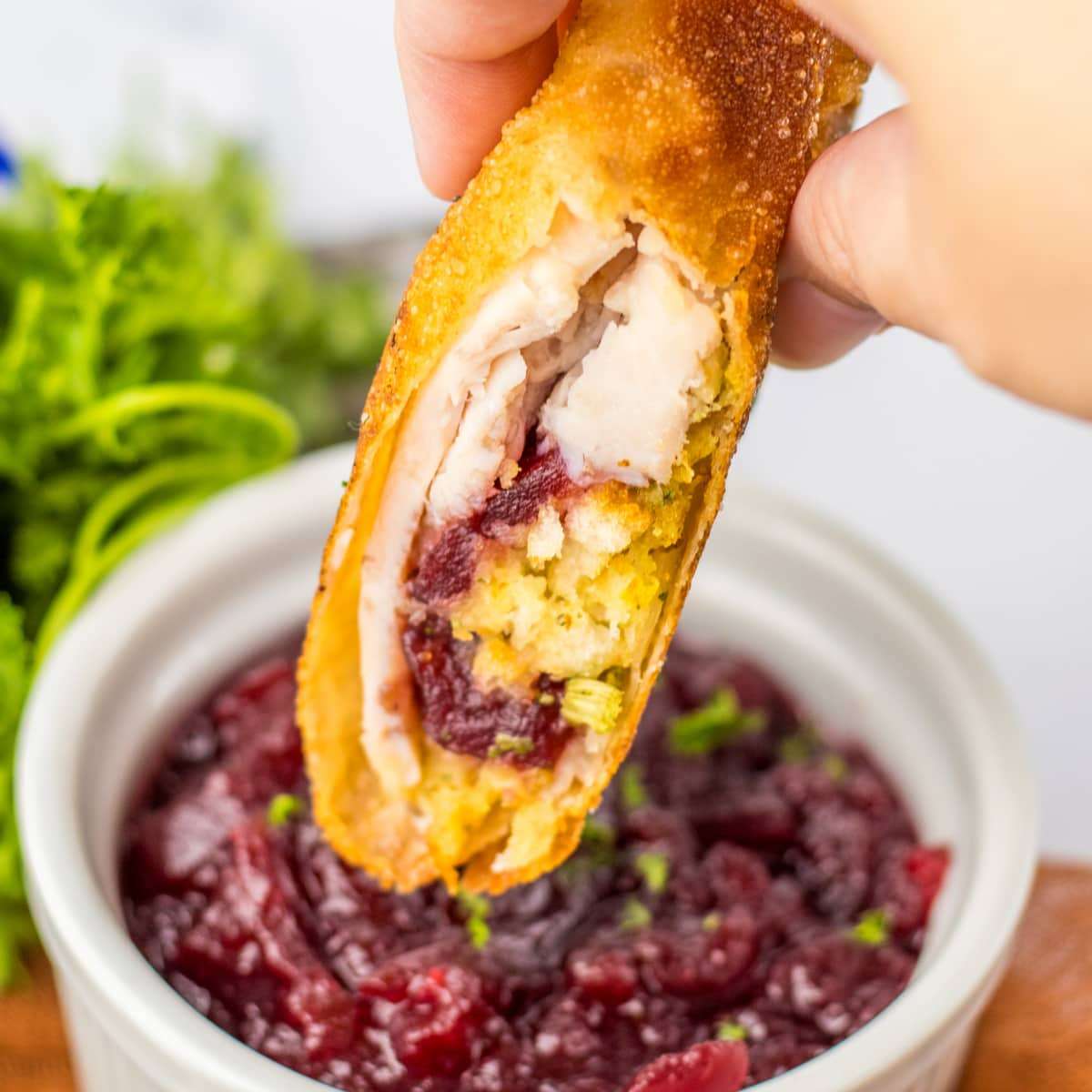 These Thanksgiving Egg Rolls are the perfect way to use leftovers from your Holiday dinner! These crispy rolls are filled with delicious turkey, cranberry sauce, stuffing and mashed potatoes, capturing the beloved flavors of Thanksgiving in a single bite.