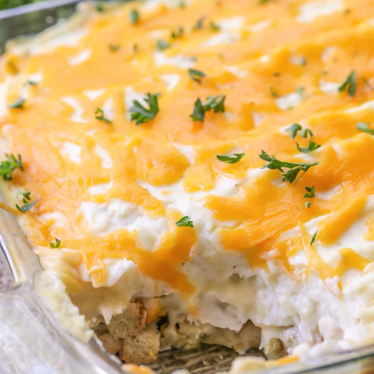 - In another large bowl, combine the turkey, soup, garlic powder, and ¼ cup sour cream. Spoon over the stuffing mixture.