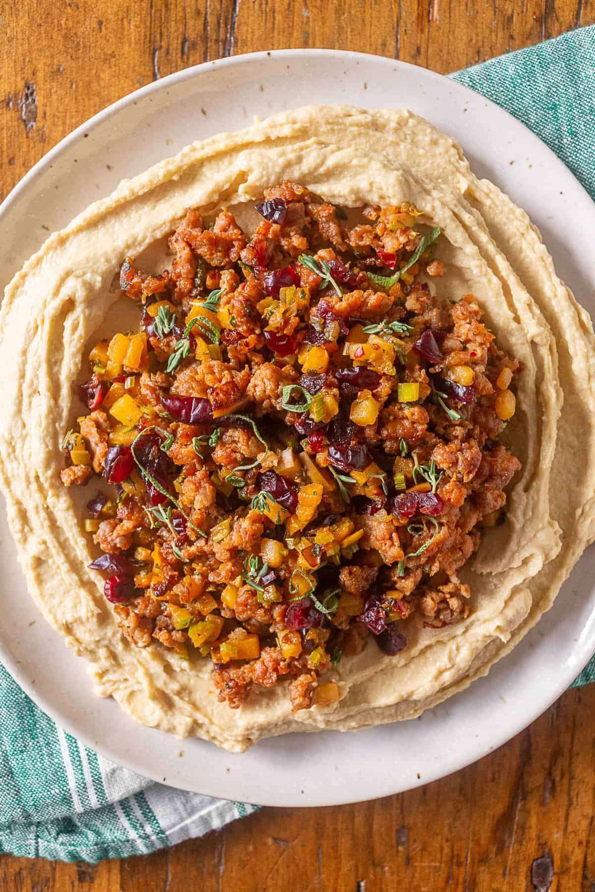 This Thanksgiving stuffing topped hummus takes all the flavors of traditional stuffing and places them right on top of hummus. It's so easy to make and full of flavor. Your whole family will love it!
