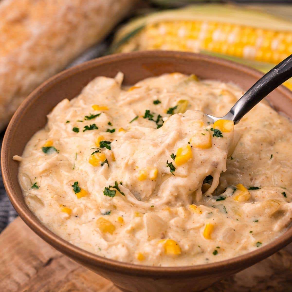 The Best Corn Chowder Recipe - delicious creamy corn chowder with shredded chicken, corn, vegetables, and a touch of a spicy kick from cayenne!