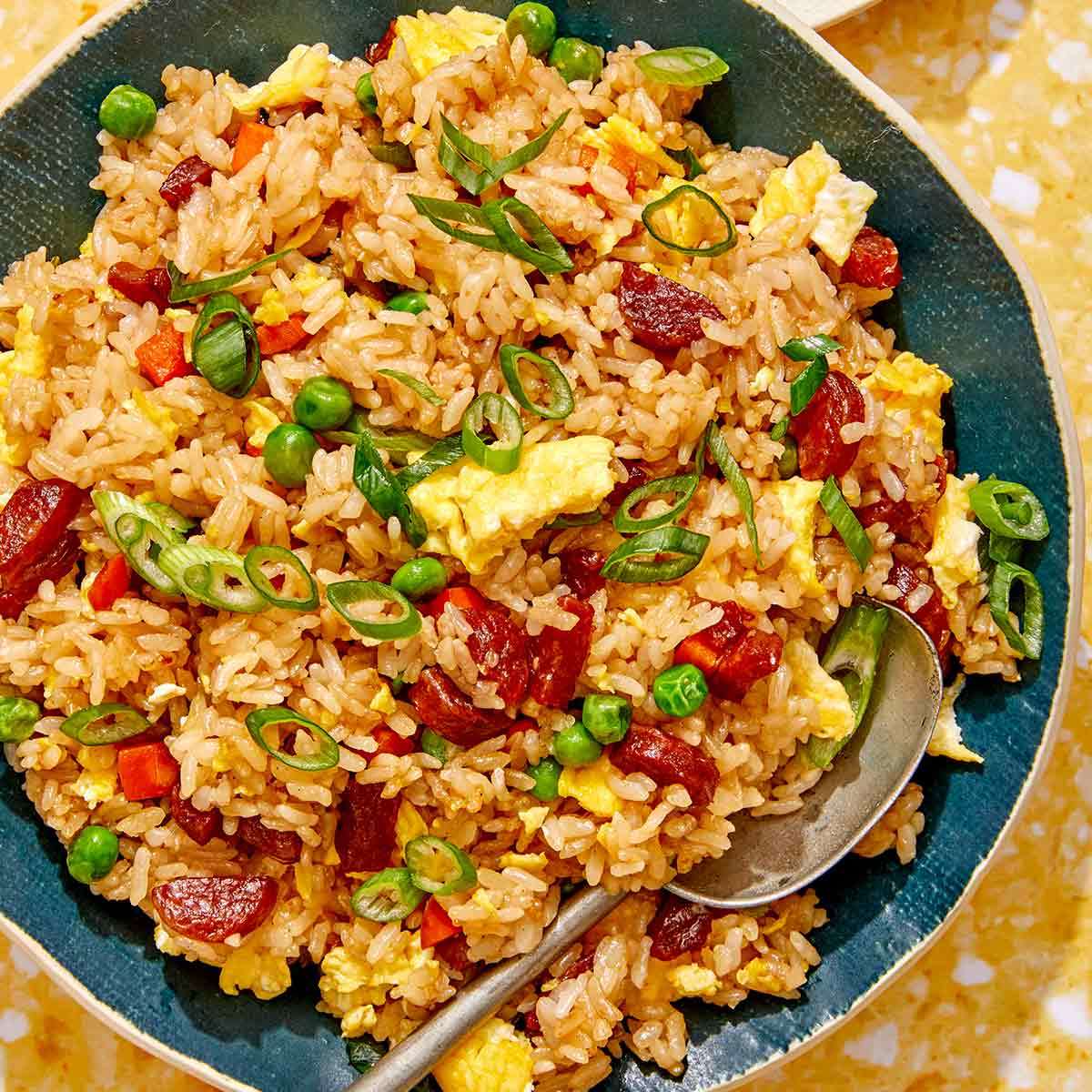 - Don't overcrowd the pan. You'll want to use a large skillet for this dish, but if all you have is something smaller, only add as much sausage, peas, and carrots to fill the bottom of the pan, working in batches if necessary. Overcrowding increases the chances of steaming the ingredients instead of sautéing them, which will prevent giving them the nice sear and crispy bits we all love so much in fried rice!