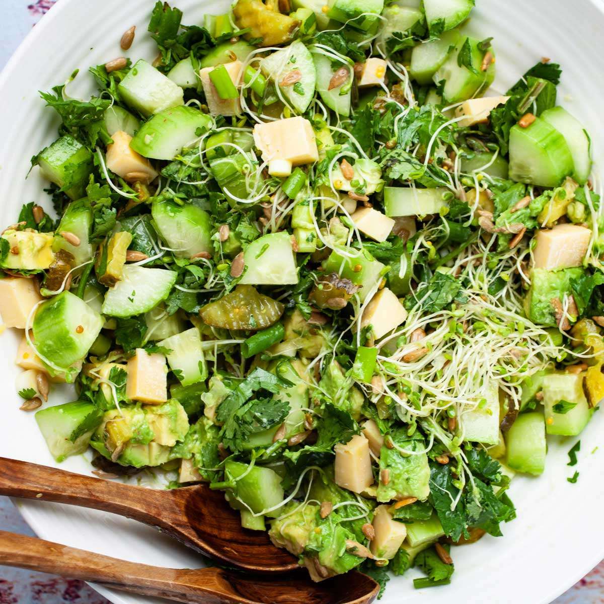 - Combine the chopped cucumber, avocado, onions, cilantro leaves, pickles, sprouts, and seeds in a large salad bowl.