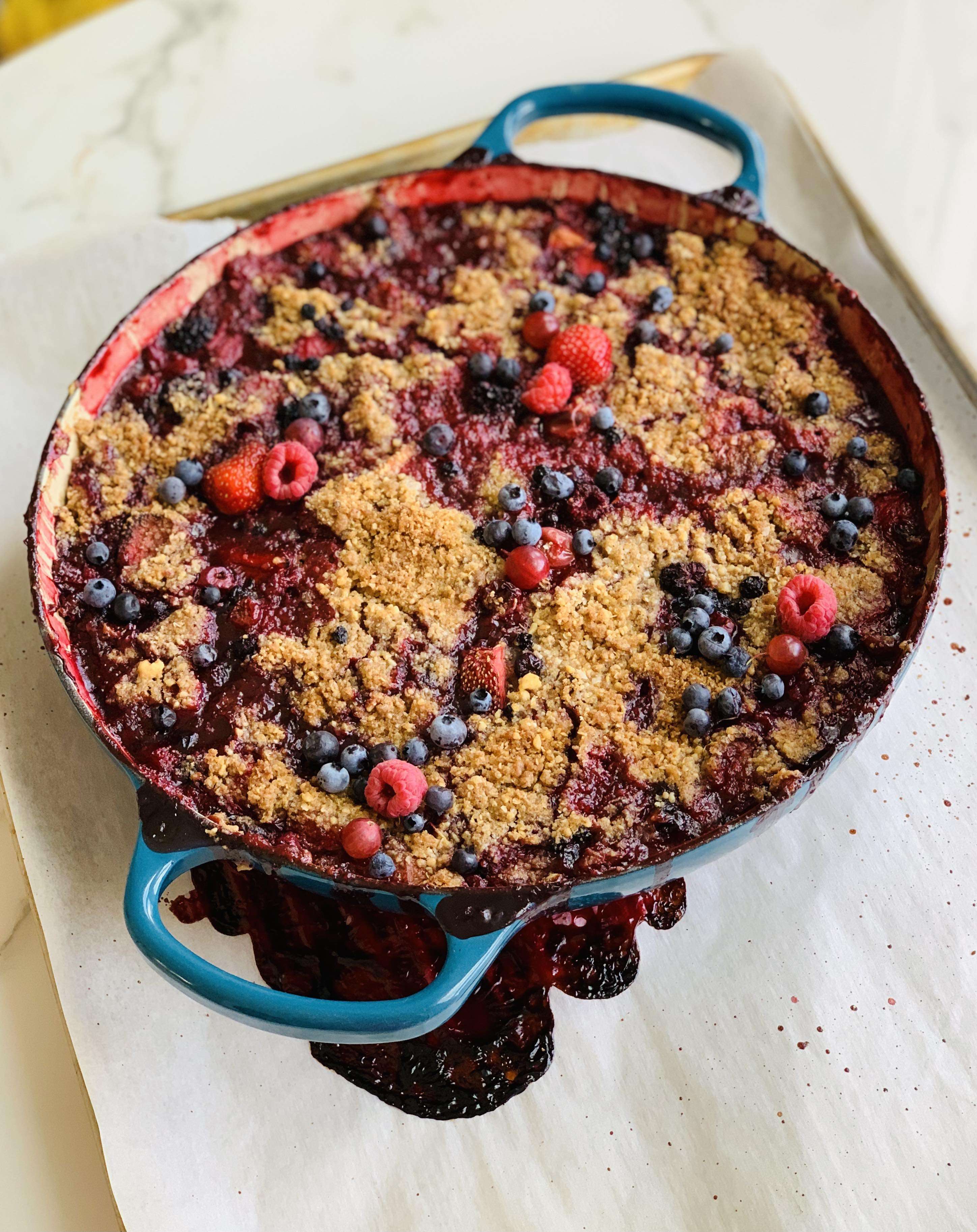 - Place the dish on a rimmed baking pan lined with parchment (in case there are spills!) and place in the oven. Bake crisp for 45-55 minutes or until juices bubble up around the sides and the fruit in the center of the dish is soft when poked with a fork.
