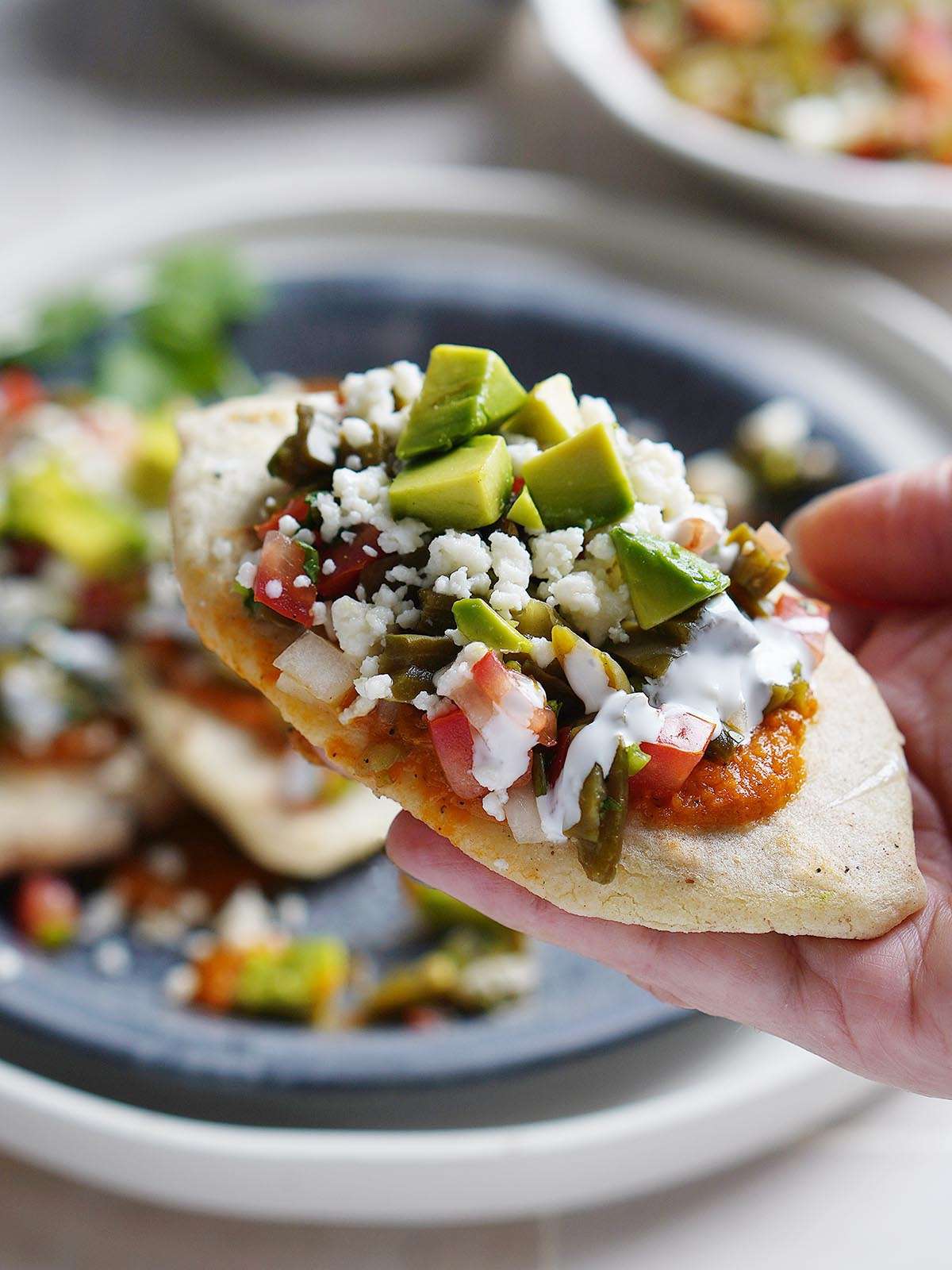 - Serve the Tlacoyos warm by layering with the nopalitos salsa and the toppings of your choice.