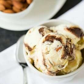 - Churn the Ice Cream: Freeze the ice cream according to the ice cream maker's instructions, adding the chopped almonds during the last minute of churning. As you transfer the ice cream to the storage container, alternate layers of the ice cream with drizzles of the fudge ripple. Once all of the ice cream is in the container, use a butter knife to gently swirl the mixture.