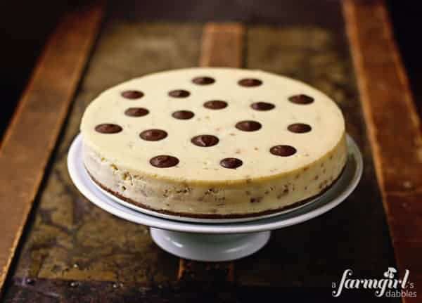 - Inspired by a great piece of cheesecake called “Chips & Chunks” that I shared with my husband at Cafe Latté in St. Paul, MN. I incorporated the chocolate polka dots after running across an irresistibly cute cheesecake at The Baker’s Daughter.