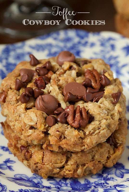 An old classic treat with a few fun twists, these delicious Toffee Cowboy Cookies are loaded with chocolate chips, sweet toffee bits and crisp toasted pecans.